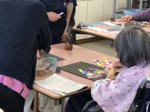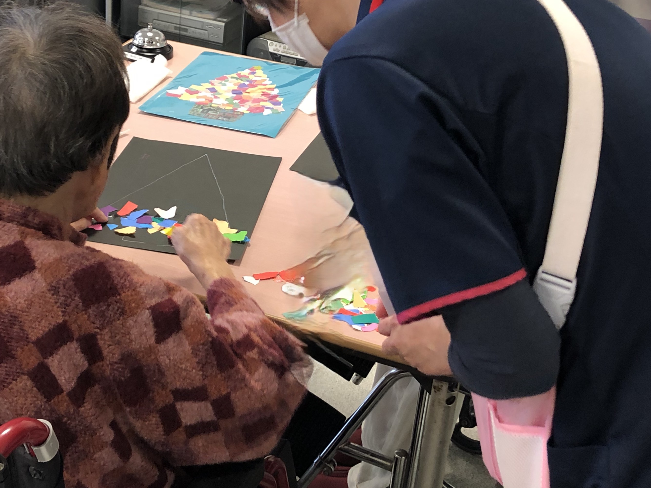 軽い体操で身体を動かしたり、季節の工作を楽しむ活動プログラムを通して穏やかにそして前向きに過ごせるよう、担当スタッフも一緒にたのしみながら行っています。