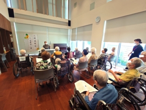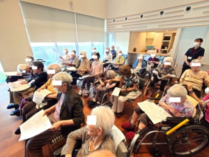 ご用意していただいた、昭和歌謡曲から、唱歌までの歌詞カードに沿って、楽器を奏で、入居者様は唄いながらと会場が一体感に包まれました。